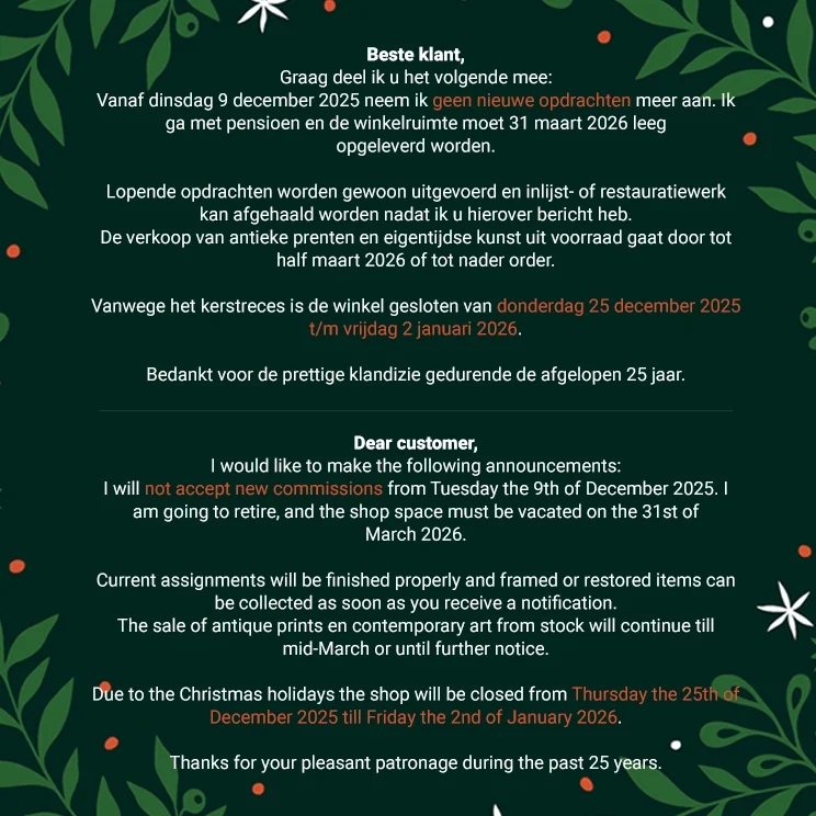 dan kunt u bij vanSteijn•lijsten terecht om deze op te laten knappen of te laten restaureren. Een opknapbeurt kan bestaan uit het schoonmaken of vervangen van glas, het vervangen van een passe-partout of andere plaatmaterialen en het bevestigen van een nieuw ophangsysteem.
